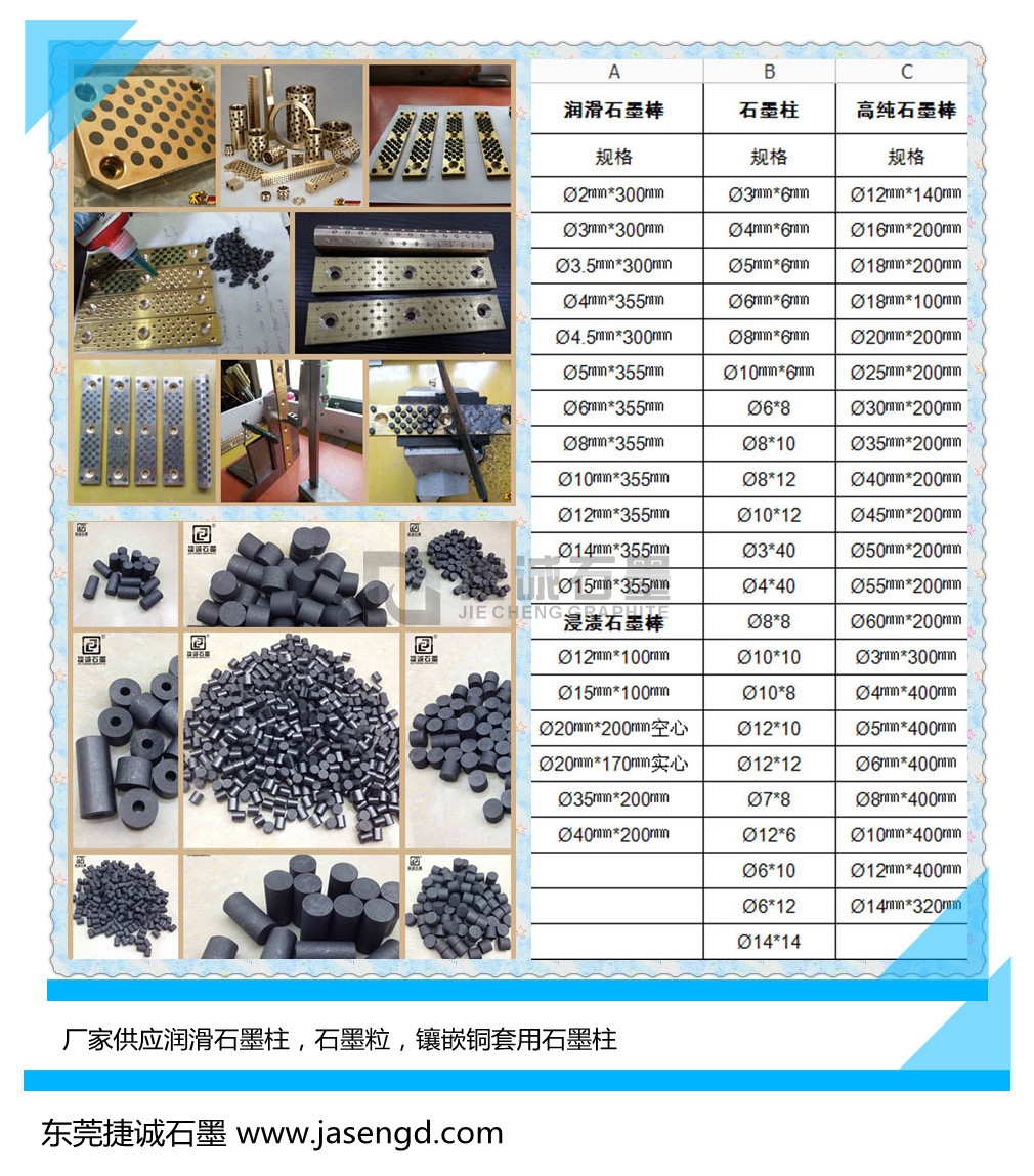 東莞市捷誠石墨制品有限公司專業(yè)生產(chǎn)石墨柱,潤滑石墨柱,銅導(dǎo)套專用石墨柱,各種規(guī)格鑲嵌銅套專用石墨柱,高純石墨柱,找石墨柱請找最專業(yè)的石墨柱生產(chǎn)企業(yè),東莞黃江捷誠石墨制品有限公司,我公司專業(yè)生產(chǎn)小規(guī)格高純石墨柱,車加工高強(qiáng)石墨柱,直徑:2mm石墨柱、2.5mm石墨柱、3mm石墨柱、3.5mm石墨柱、4mm石墨柱、5mm石墨柱、6mm石墨柱、7mm石墨柱、8mm石墨柱、9mm石墨柱、10mm石墨柱、12mm石墨棒、13mm石墨棒、14mm石墨棒、15mm石墨棒、16mm石墨棒、18mm石墨棒、20mm石墨棒、22mm石墨棒、25mm石墨棒、30mm石墨棒。高度;100mm、150mm、200mm、300mm、320mm、400mm、420mm,密度1.72-1.75,電阻5-6歐姆,最大顆粒0.8.彎曲強(qiáng)度大于13兆帕,抗壓強(qiáng)度大于32兆帕,灰分小于0.2%。適用于導(dǎo)柱導(dǎo)套無油自滑潤石墨柱,青銅鑲石墨柱,銅鑲石墨柱,無油自滑潤石墨柱